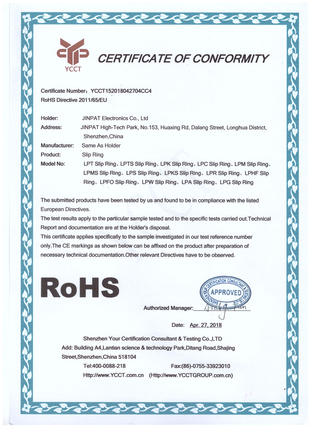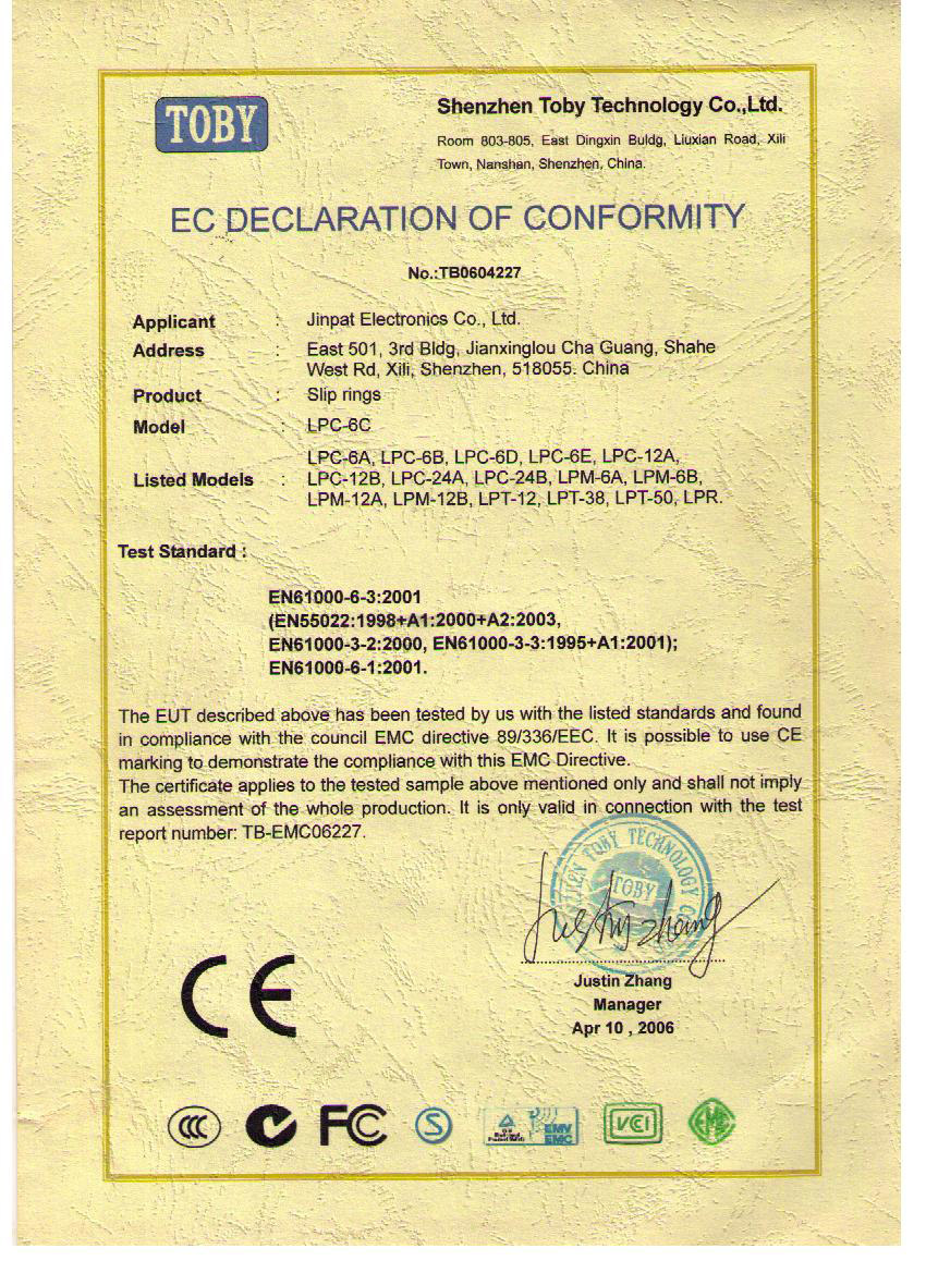 晶沛通過(guò)了歐盟CE認(rèn)證风光旖旎、FCC認(rèn)證畏首畏尾、SGS認(rèn)證人山人海、BV“船級(jí)社”認(rèn)證、防爆認(rèn)證等多項(xiàng)認(rèn)證,生產(chǎn)的導(dǎo)電滑環(huán)都符合RoHS環(huán)保要求,先后被授予“國(guó)家高新技術(shù)企業(yè)”稱(chēng)號(hào),目前已獲得45項(xiàng)專(zhuān)利,其中發(fā)明專(zhuān)利6項(xiàng)。